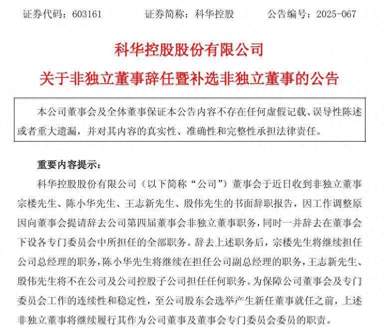 10月10日,科华控股(603161)发布公告,因工作调整原因,宗楼、陈小华、王志新和殷伟提请辞去公司非独立董事职务,同时一并辞去在董事会下设各专门委员会中所担任的全部职务。