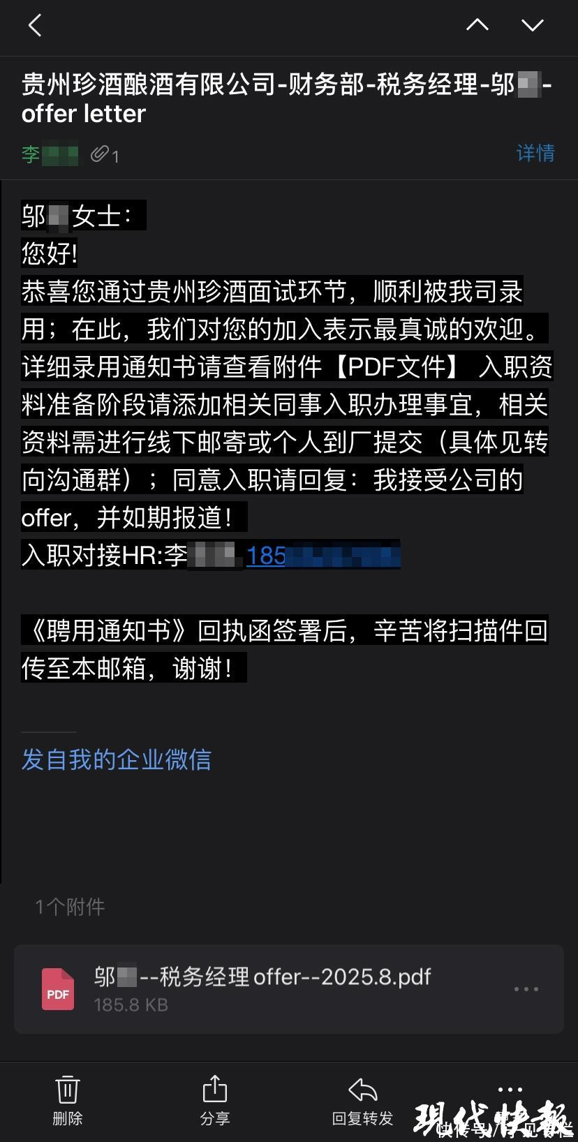 图源:现代快报,邬女士收到的offer邮件